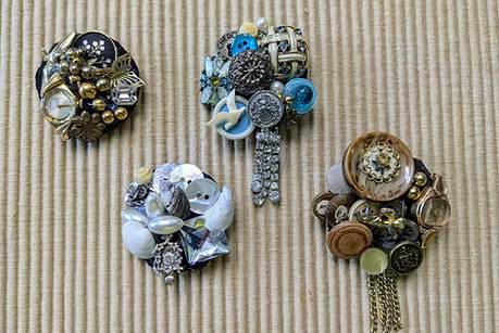 –Gather your family’s forgotten treasures to make yourself a memory brooch! Repurpose buttons, beads, watchfaces, chains, earrings, old lace, etc., to make brooches at home, for yourself or for gifts.
